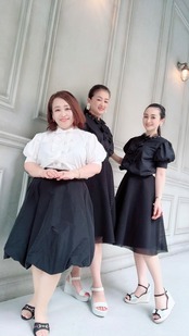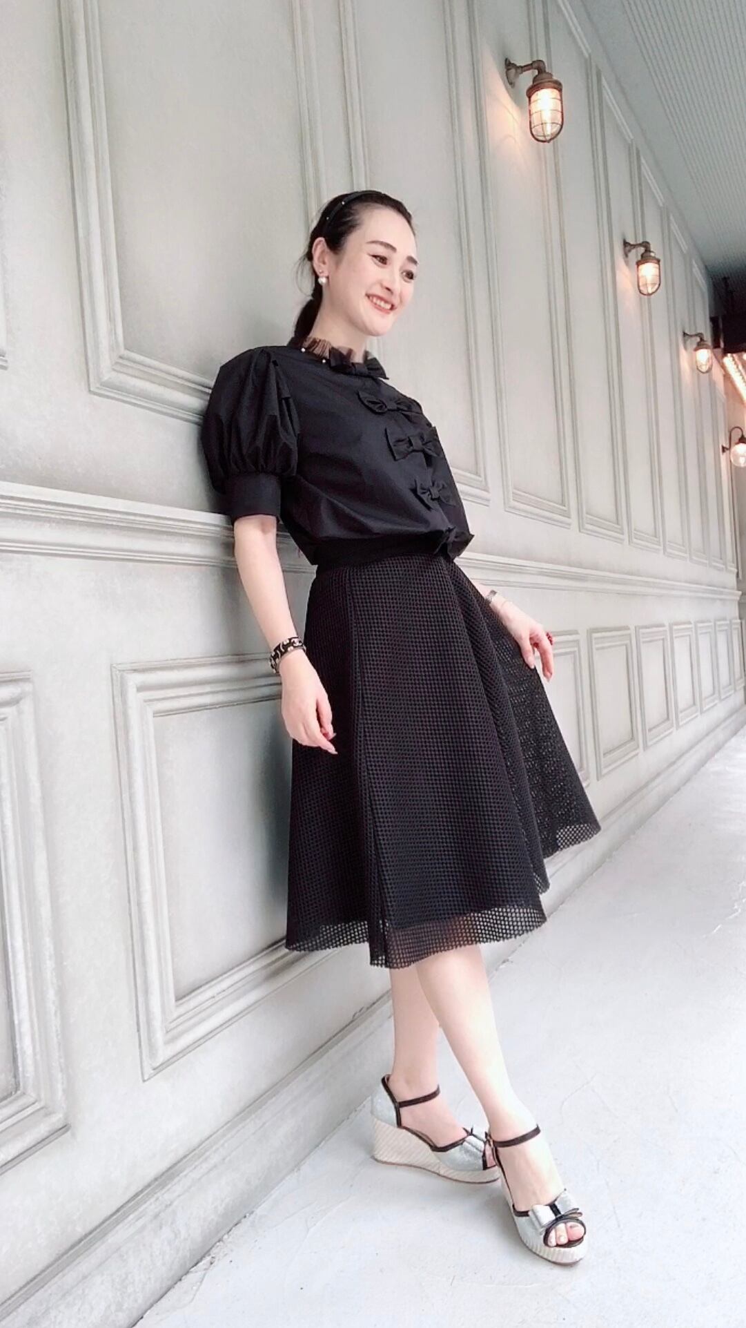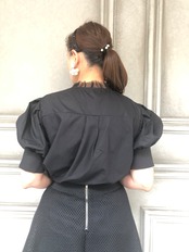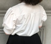 お袖がぽわんとしたパフスリーブが可愛いブラウスです。前見頃の首元にはパール付き、前開きです。